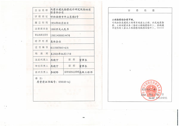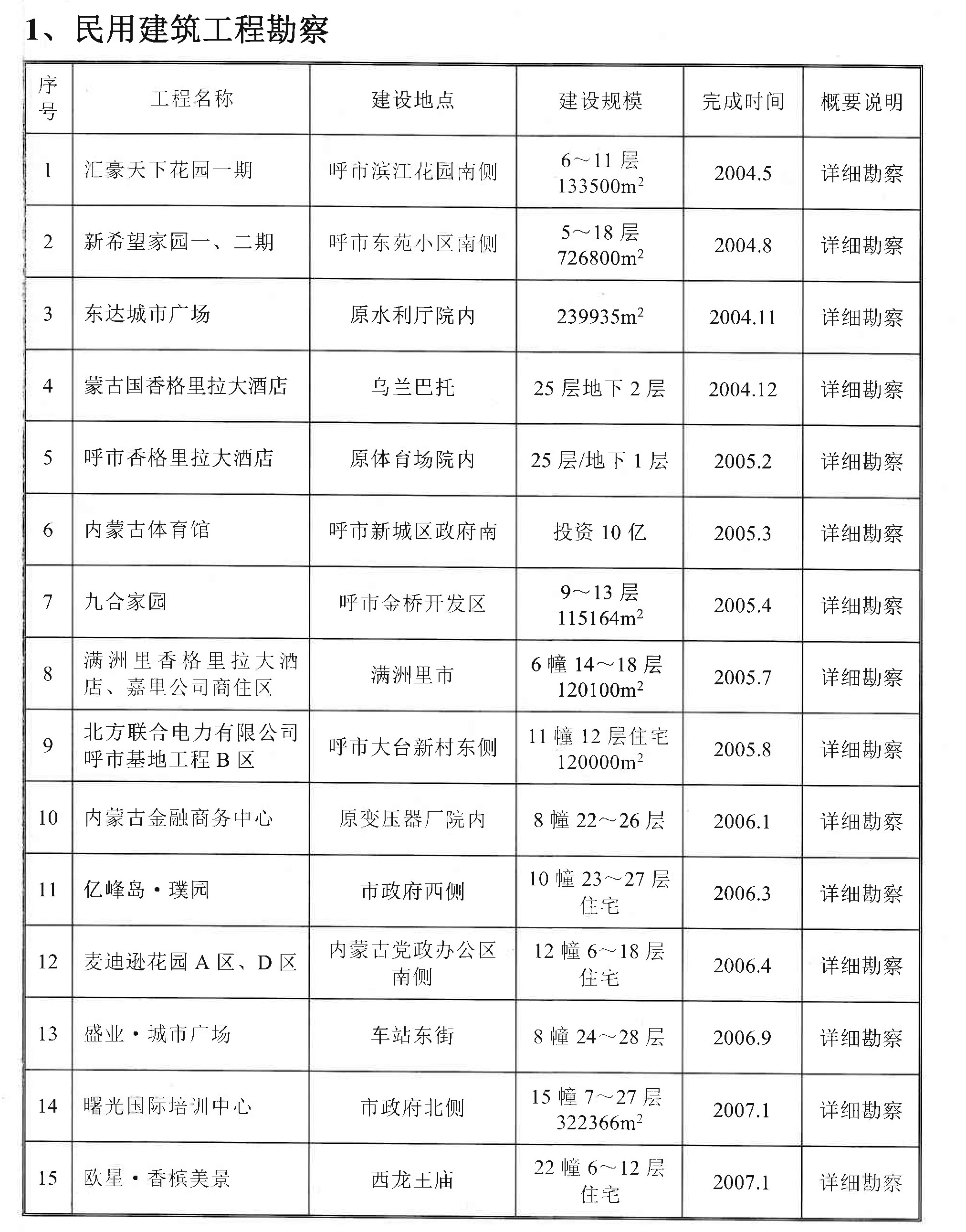 - 內(nèi)蒙古建筑勘察設(shè)計(jì)研究院勘測(cè)有限責(zé)任公司,是全國(guó)首家完成 轉(zhuǎn)企建制的省級(jí)建筑勘察設(shè)計(jì)單位。公司前身為內(nèi)蒙古建筑勘察 設(shè)計(jì)研究院勘測(cè)分院, 成立于1954年 ,經(jīng)過六十多年的發(fā)展, 現(xiàn)已成為全區(qū)技術(shù)力量雄厚、專業(yè)設(shè)置齊全的集巖土工程勘察 、 設(shè)計(jì)、治理、檢測(cè)、監(jiān)理、咨詢、水文地質(zhì)勘查、工程測(cè)量、科 研為一體的綜合性企業(yè) ... ... [查看詳情]